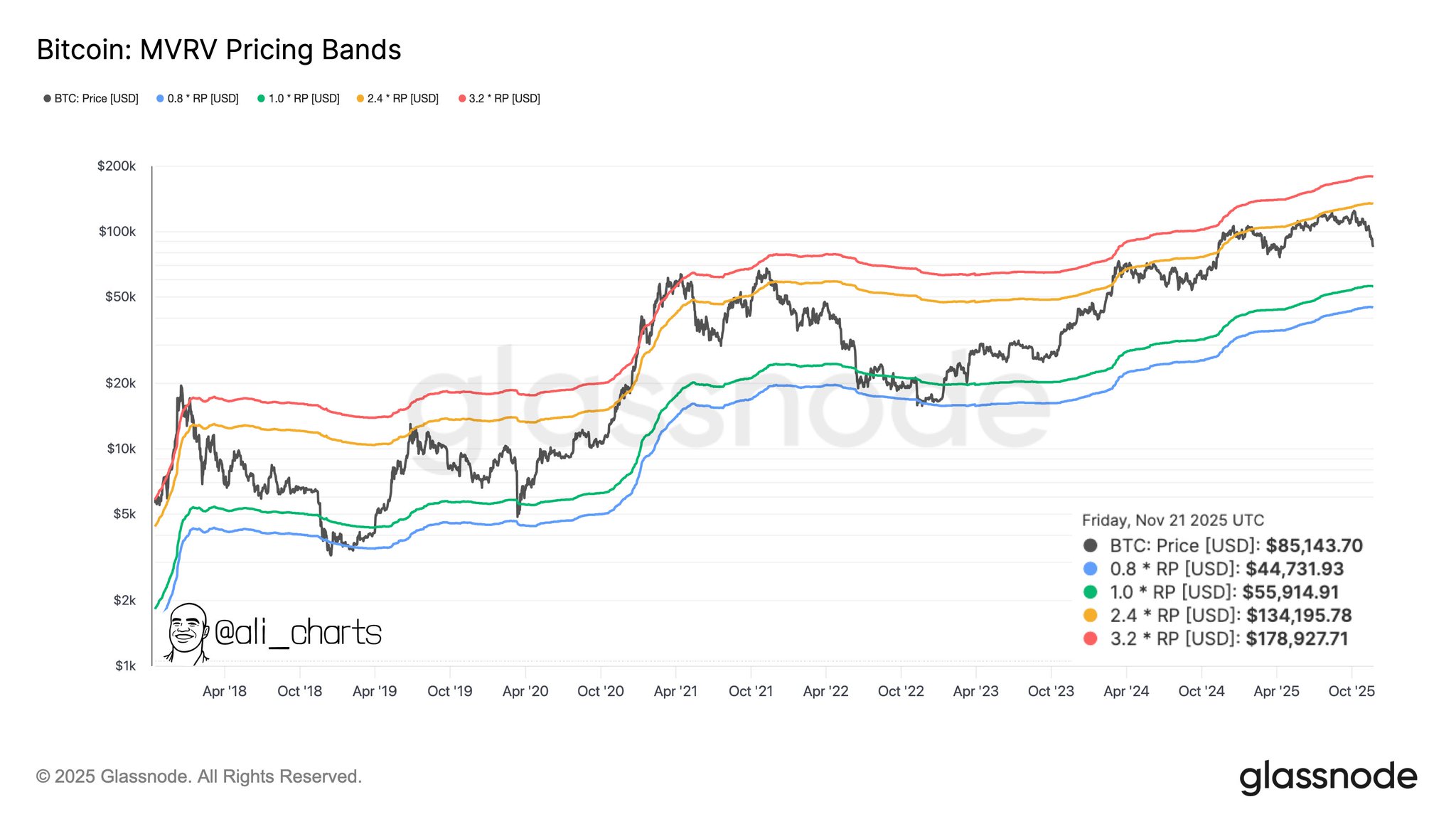 El analista de criptomonedas Ali Martinez destaca el potencial de una caída más profunda al examinar los mínimos históricos de Bitcoin dentro de ciertos rangos de precios. Martinez señala que Bitcoin ha tocado fondo anteriormente dentro de las bandas verdes y azules, y si este patrón se repite, el precio podría caer a $44,700. Tal caída reflejaría una pérdida adicional del 50% respecto a los precios actuales.