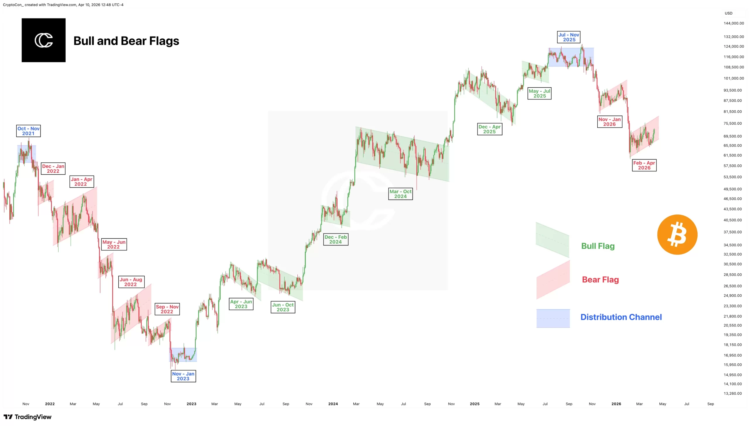 Observando las tendencias técnicas, los analistas han trazado paralelismos con 2022, cuando aparecieron cinco patrones de bandera bajista en el gráfico de Bitcoin y el mercado alcanzó un ciclo de fondo. Aunque CryptoCon, un analista muy seguido, reconoce que ninguna formación de gráfico puede predecir el futuro, señala similitudes que podrían sugerir otro periodo de corrección es posible. Específicamente, persistir dentro de la segunda bandera bajista podría ser una señal de advertencia de más caídas por delante.