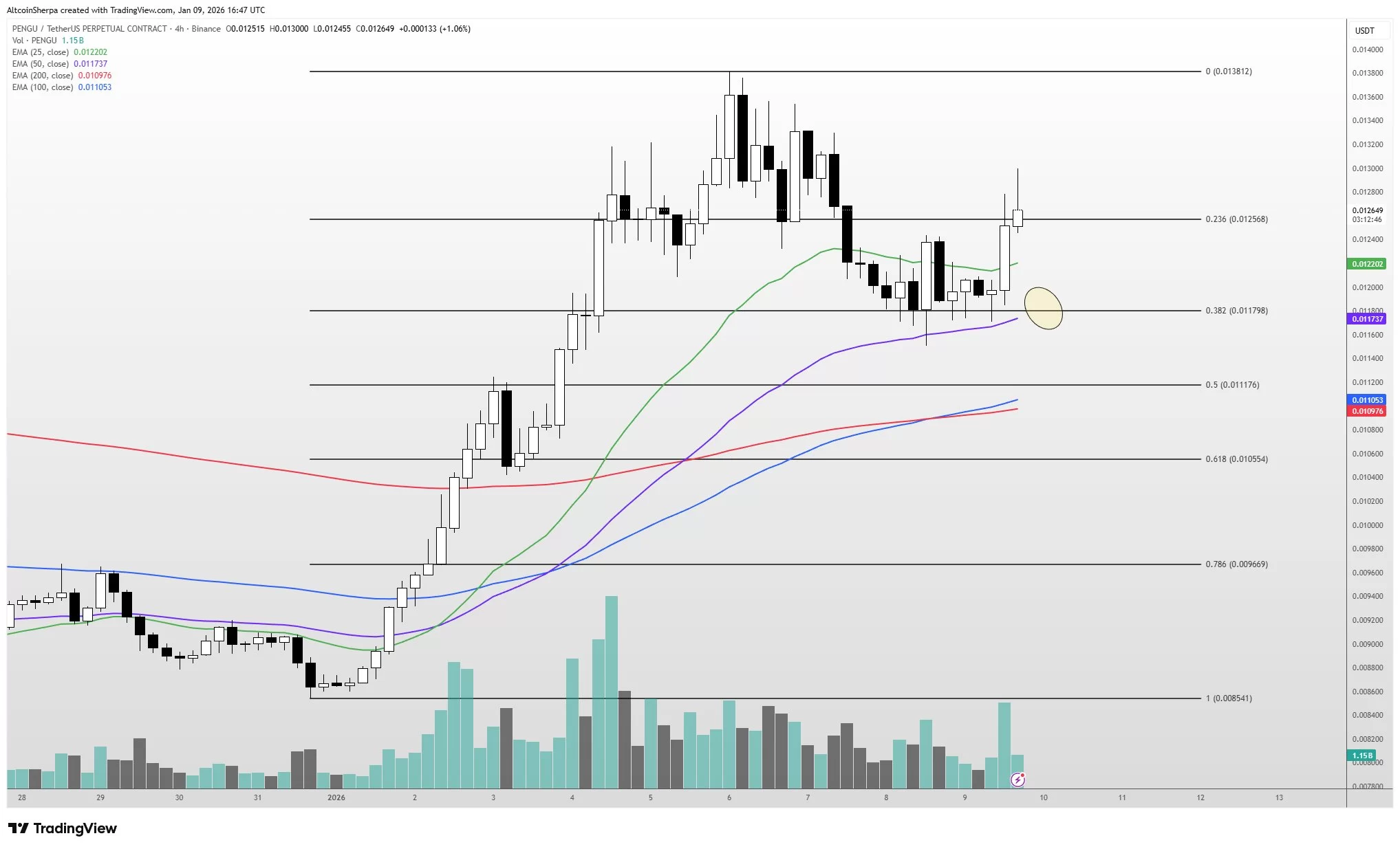 El 8 de enero, Sherpa expresó un sentimiento positivo sobre PENGU Coin, sugiriendo posibles compras alrededor de $0.0112. Con pocas memecoins integrando múltiples sectores, PENGU se destaca por su conexión tangible a la vida real, obteniendo evaluaciones positivas de muchos analistas. La reciente reacción del mercado ha deleitado a Sherpa.