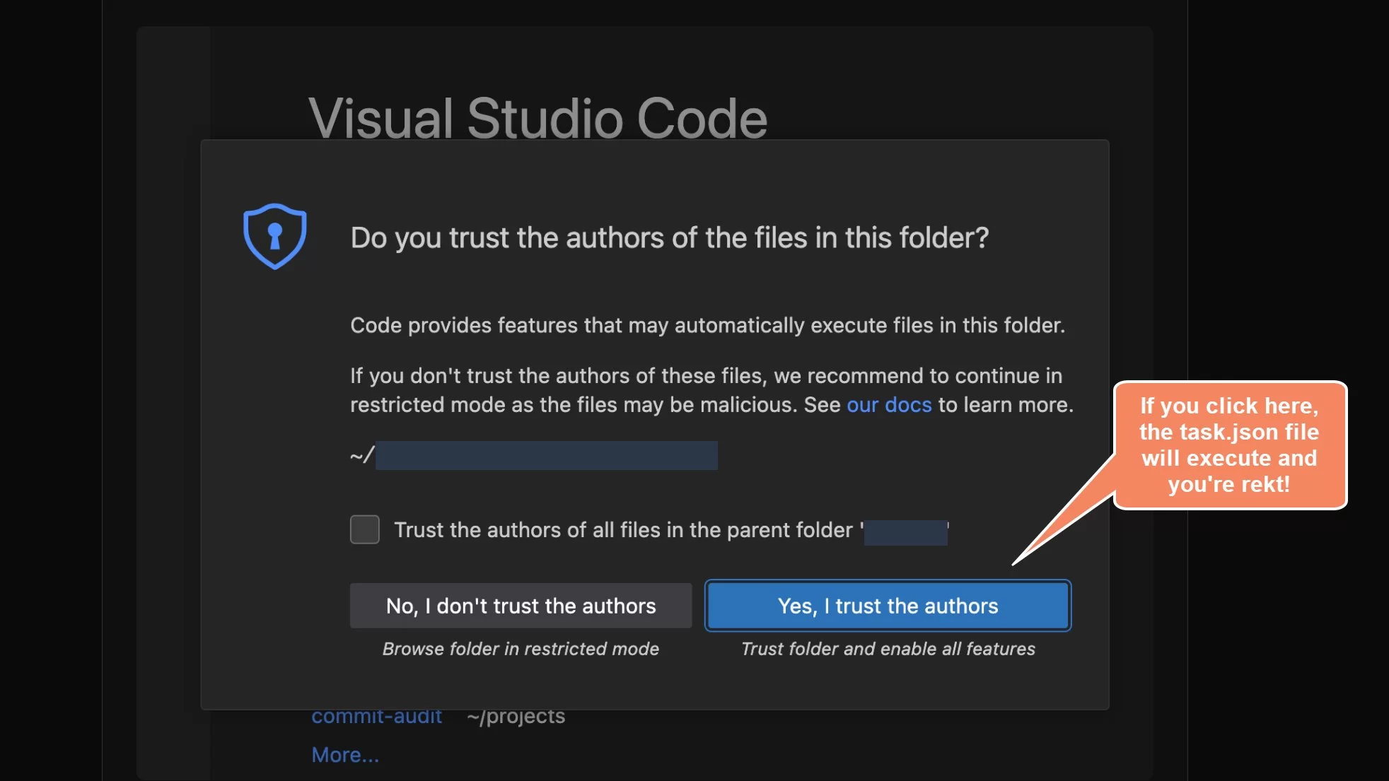 - Un ataque basado en repositorio derivado de una vulnerabilidad conocida de VSCode y Cursor, que permaneció sin parchear desde diciembre de 2025 hasta febrero de 2026. Abrir un archivo o repo ejecutaría silenciosamente código arbitrario sin advertencia o aviso, según lo señalado por investigadores de seguridad en ese momento.
