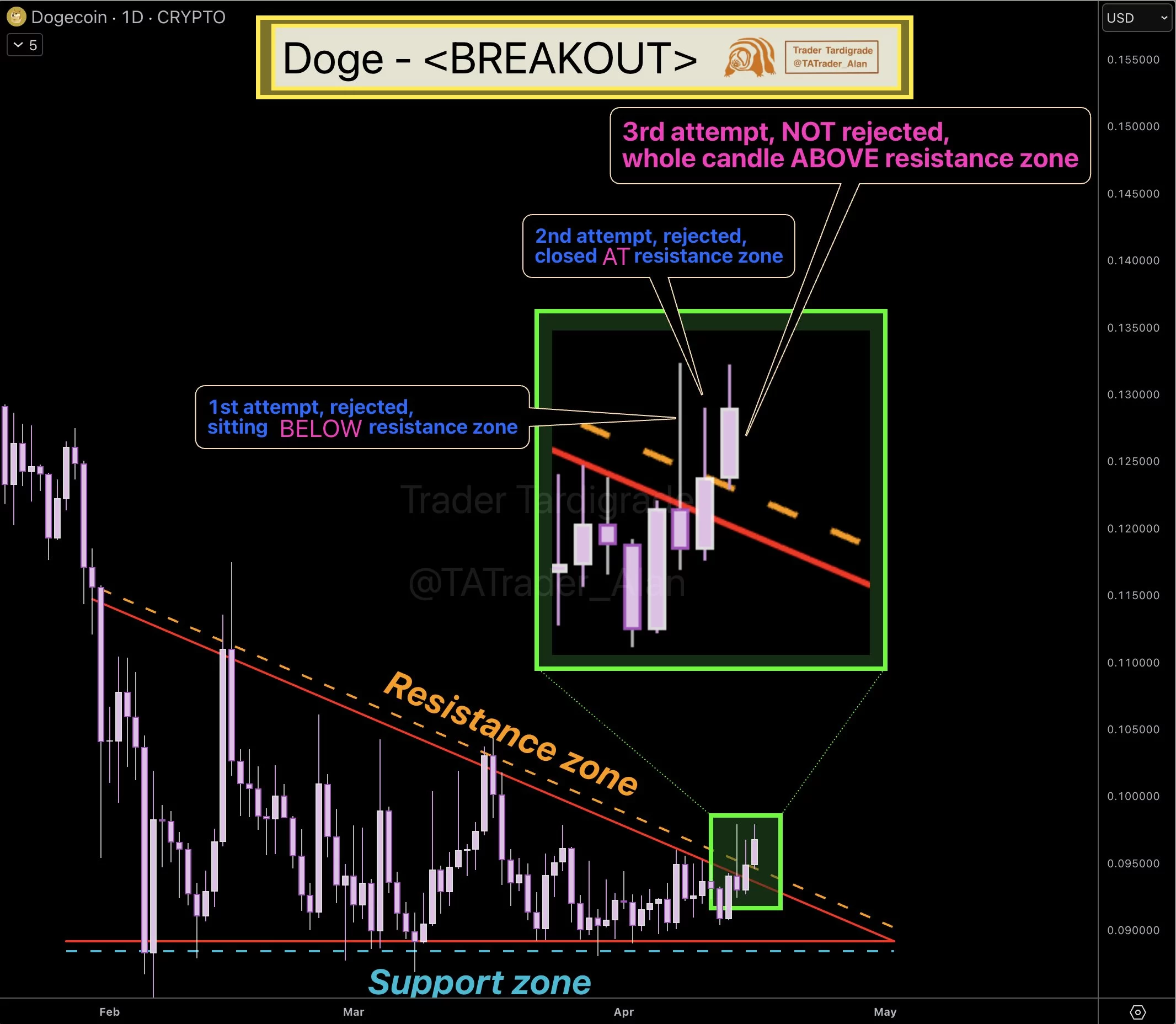 Antes de la última caída de Bitcoin, el analista TATrader_Alan destacó la evolución dinámica de Dogecoin. Enfocándose en tres patrones de velas distintos, el analista notó una transición en el gráfico de DOGE de una dominancia vendedora a un creciente impulso comprador. Argumentó que el triángulo descendente bajista de Dogecoin ahora se ha roto de manera convincente al alza, sugiriendo que la tendencia bajista puede haber terminado. Si esto se mantiene, DOGE podría probar el nivel de $0.20 en los próximos meses.