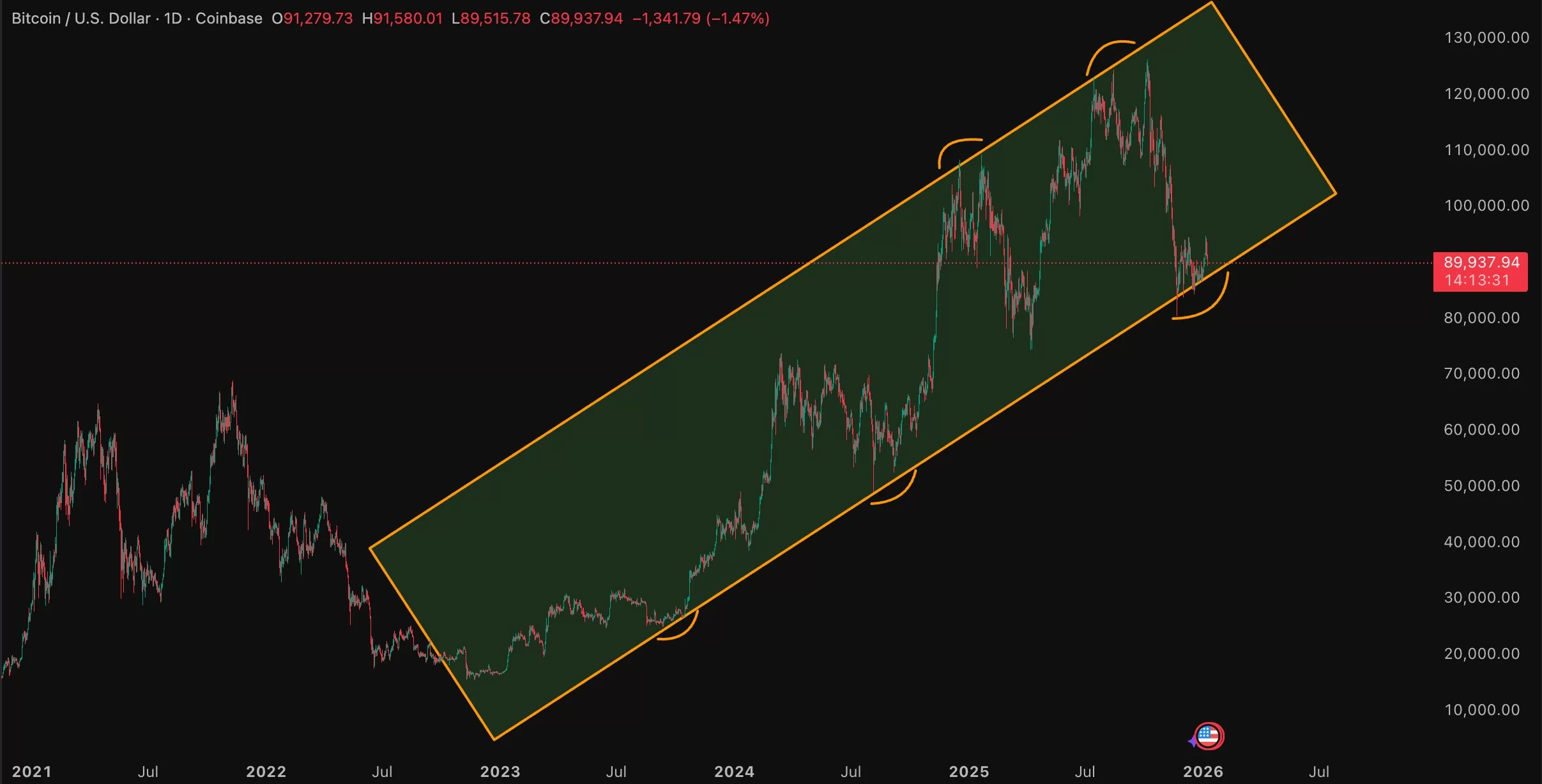 “Desde que comenzó el ciclo, Bitcoin se ha movido dentro de este canal ascendente. A pesar de la alta presión de venta y la caída del 10/10/25, BTC aún no ha roto este canal. Si el canal se mantiene, podríamos ver un nuevo ATH en 2026.”