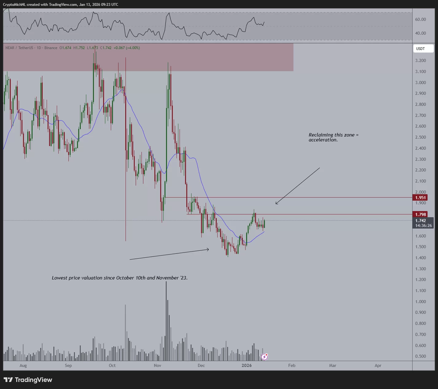 NEAR, formando un mínimo más alto, está actualmente dispuesto a moverse hacia la región de resistencia. Para NEAR, una de las altcoins favoritas de Michael Poppe, el objetivo es el umbral de $3 al romper la resistencia.