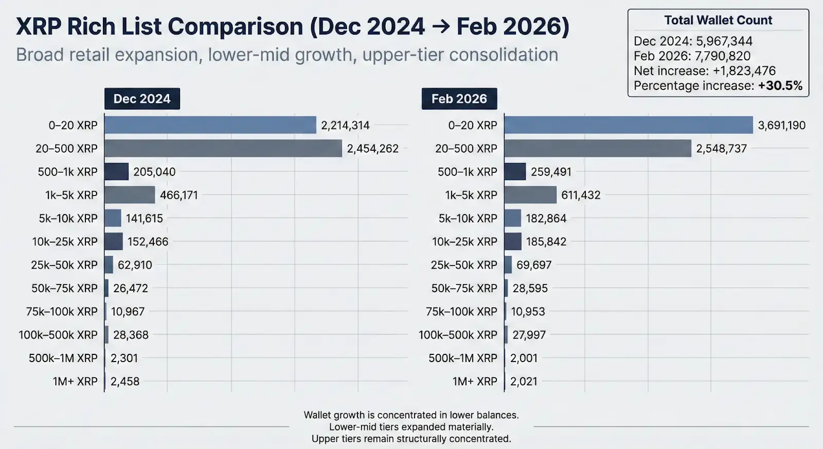 Entre diciembre de 2024 y febrero de 2026, el número total de billeteras de XRP aumentó de 5.97 millones a 7.79 millones, señalando una actividad y expansión sin precedentes en el ecosistema. Lo más notable es el aumento drástico en las billeteras que contienen menos de 500 XRP, lo que apunta a una creciente confianza entre los inversores a pequeña escala y a la reducción de las barreras para ingresar al mercado. Mientras tanto, un aumento constante en las cuentas que tienen entre 500 y 10,000 XRP subraya una adopción colectiva de estrategias de acumulación a largo plazo entre los ahorradores individuales.