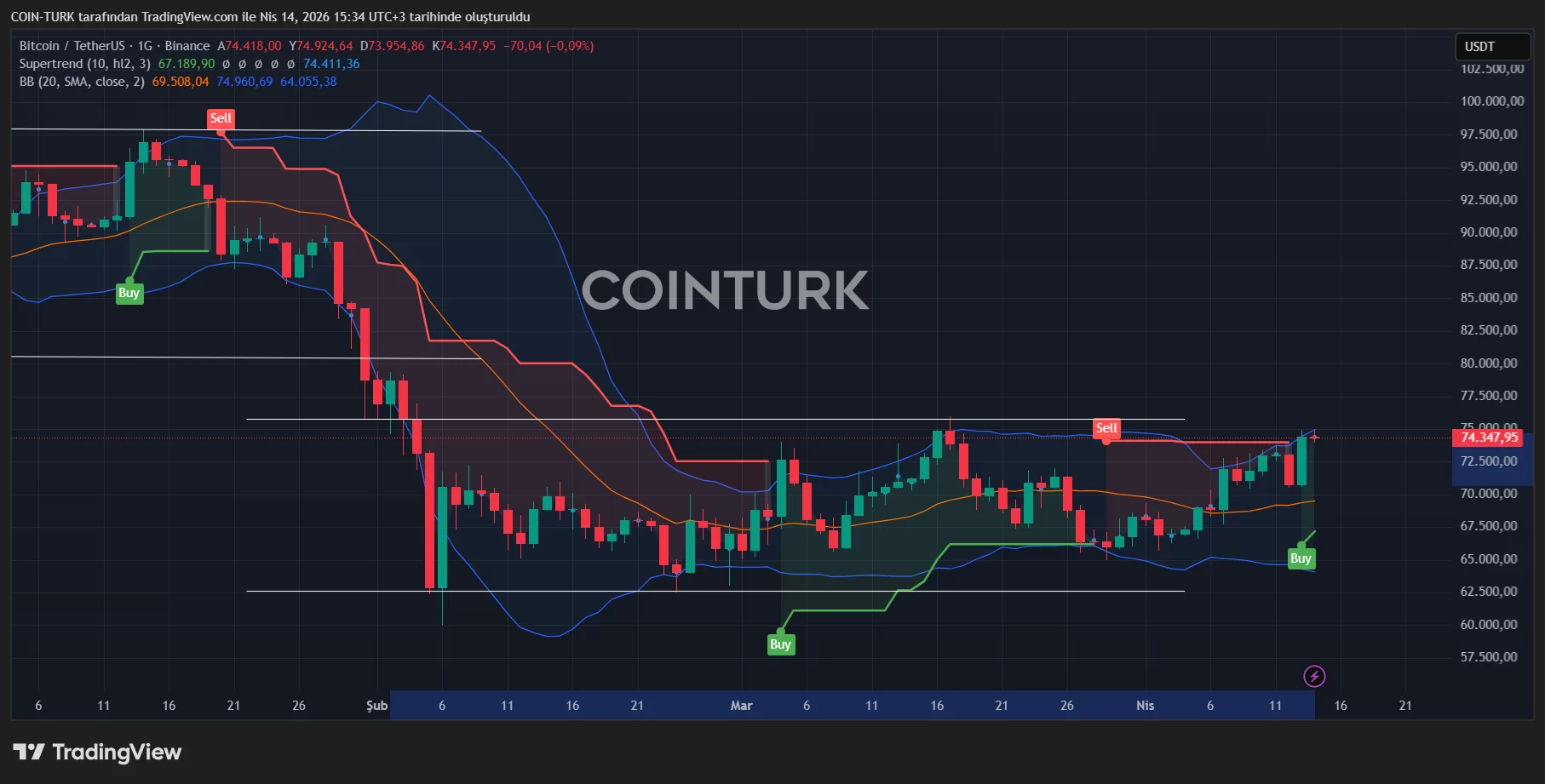 Para Bitcoin, estos son números óptimos, especialmente considerando el conflicto geopolítico en curso. El hecho de que el IPP subyacente mensual se mantuvo estable es especialmente alentador para los comerciantes de criptomonedas. Bitcoin estaba cerca de los $74,400 mientras los mercados estadounidenses se preparaban para abrir; si la hora de apertura trae más compras, se podría probar el siguiente nivel de resistencia en $75,727.