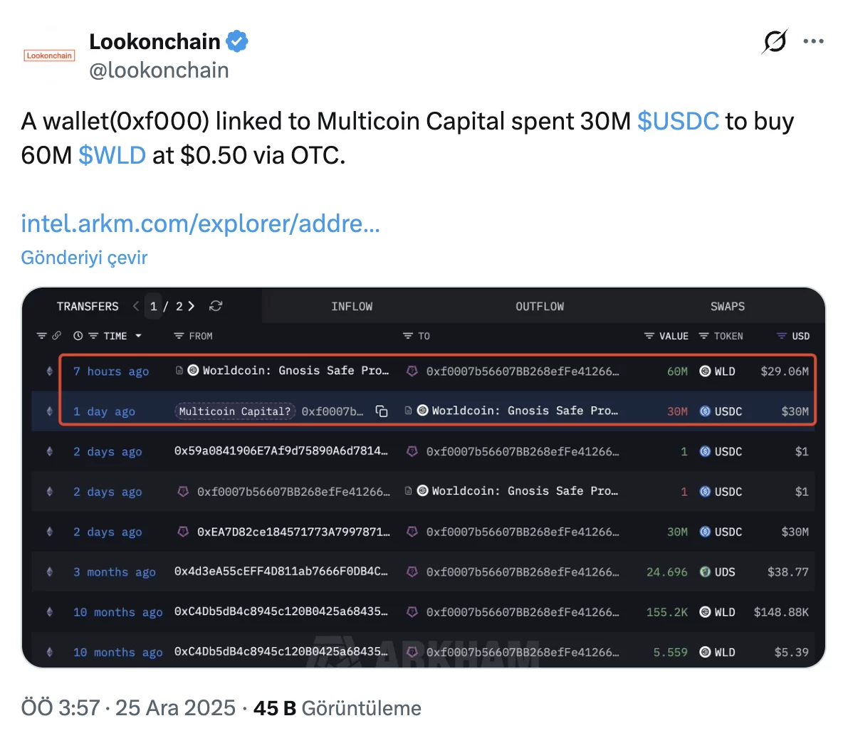 Según la plataforma de datos en la cadena Lookonchain, una cartera vinculada a Multicoin Capital ejecutó una transacción extrabursátil (OTC), gastando 30 millones de USDC para adquirir un total de 60 millones de WLD. La compra, realizada a un precio promedio de $0.50, señala una fuerte demanda institucional a los ojos de los observadores del mercado. Las transacciones OTC a menudo buscan realizar compras de gran volumen sin impactar directamente en el mercado, posiblemente sugiriendo una estrategia de inversión a largo plazo.