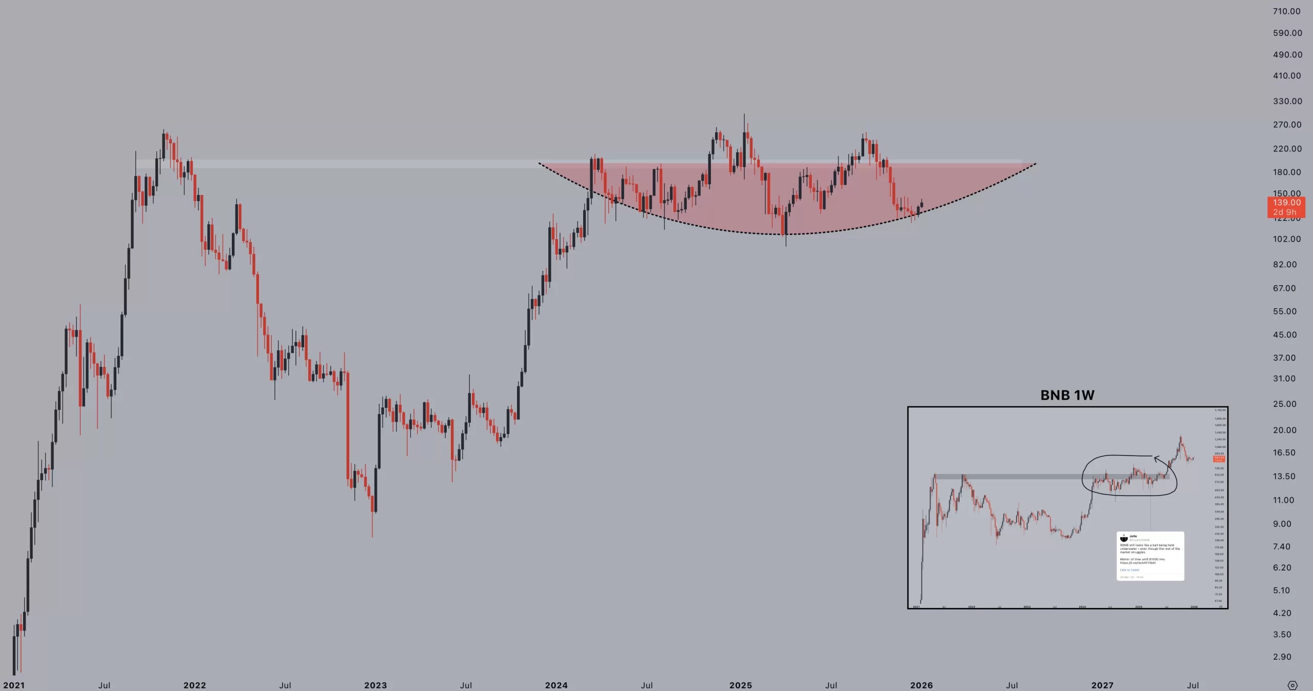 Solana (SOL) se mantiene alrededor de $138, exhibiendo inactividad prolongada. El analista Jelle comentó, observando los paralelismos con BNB, sugiriendo que SOL podría permanecer plano indefinidamente antes de repuntar inesperadamente. Jelle espera resultados similares mientras continúa manteniendo sus monedas.