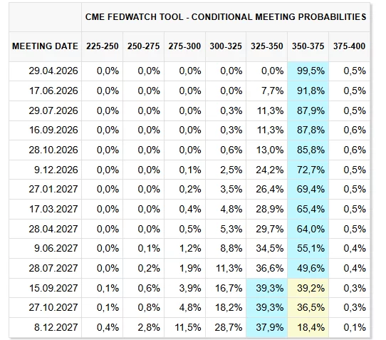 Para los inversionistas en criptomonedas, estas expectativas cambiantes tienen implicaciones significativas. Al inicio del año, el mercado había anticipado en gran medida un regreso al alivio monetario en EE.UU. y en el extranjero. Sin embargo, con el Banco Central Europeo insinuando que cualquier cambio en las tasas probablemente significará aumentos, no recortes, y la Fed sin prisa por bajar las tasas, mantener las tasas estables ahora aparece como el camino más probable. La herramienta FedWatch ahora indica que reducciones significativas en las tasas podrían materializarse solo en 2027 como muy pronto, silenciando las esperanzas de un giro moderado más temprano.